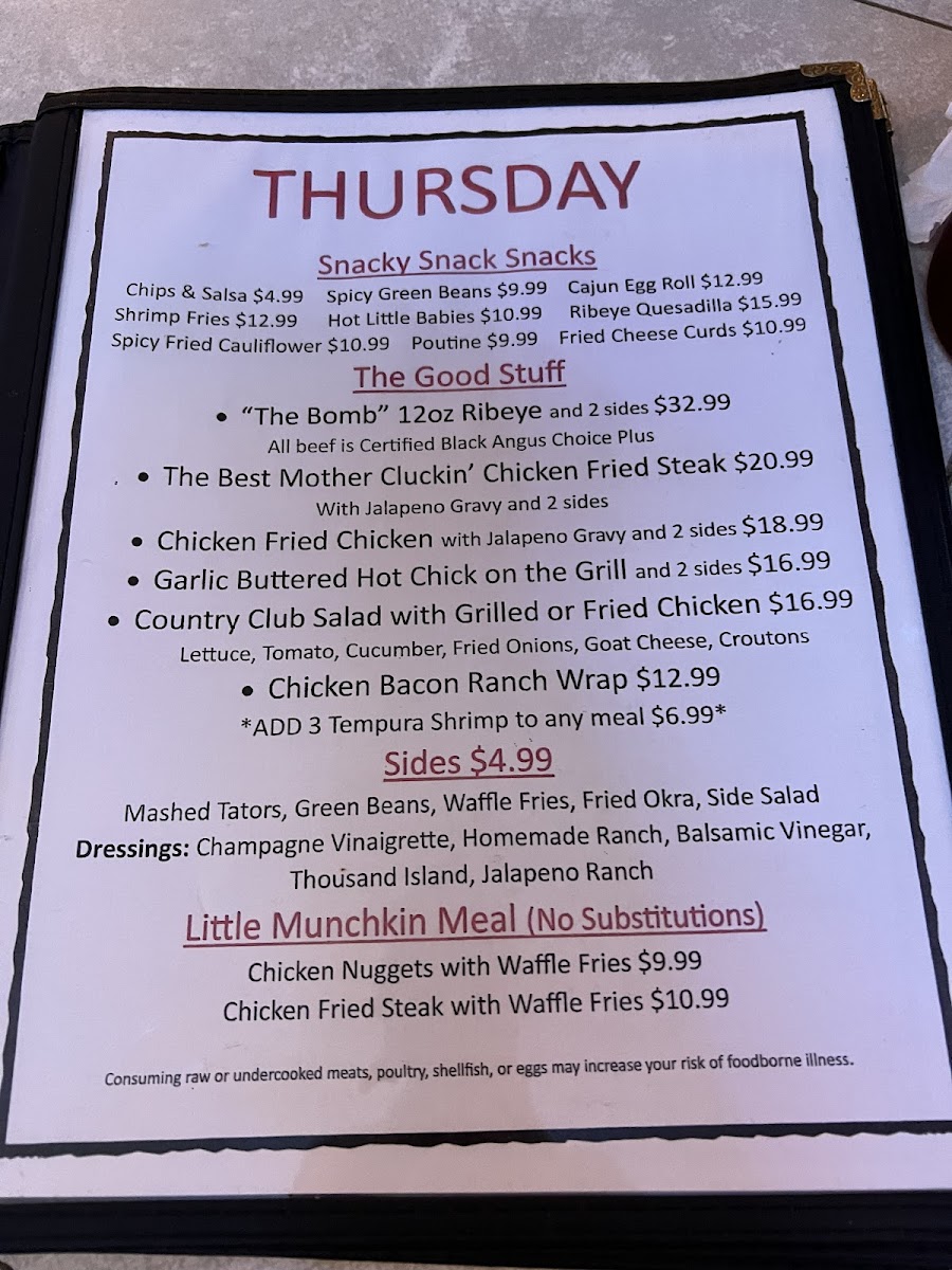 For appetizers, indulge in Spicy Fried Cauliflower or Fried Cheese Curds, each dish designed to tickle your taste buds. The real heart of the menu lies in the entrées, showcasing mouthwatering options like the award-winning Best Mother Cluckin' Chicken Fried Steak. Reviews highlight the rich flavors, especially the gravy and seasoned sides that perfectly complement the dishes.